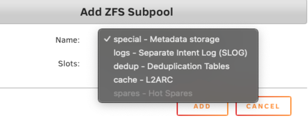 Unraid se réfère aux vdevs de support ZFS comme des sous-pools. La plupart des utilisateurs n'en ont pas besoin, mais les utilisateurs avancés peuvent les rencontrer :