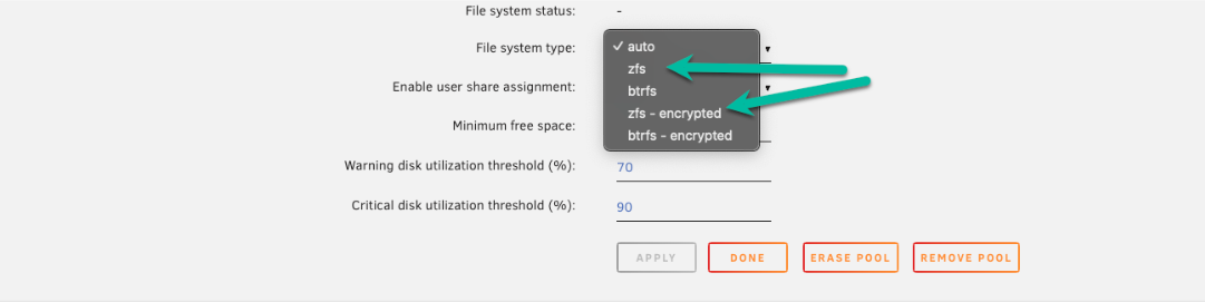 - Définissez le système de fichiers sur "Auto" : Cliquez sur le nom du pool (par exemple,