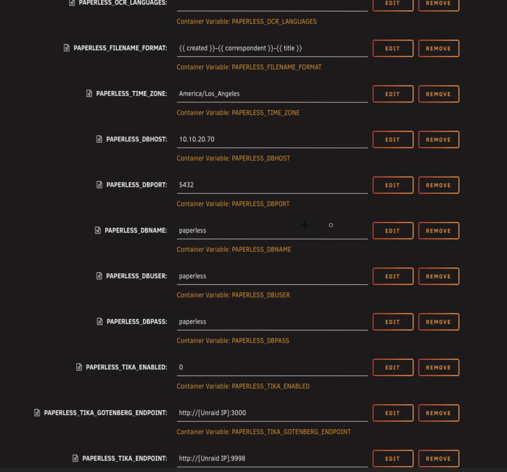 If you're planning to follow the rest of this guide, put these variables in now with your Unraid server's IP address. It'll save you coming back to edit the template later. If you're just setting up the basic Paperless system, you can skip these three entirely.