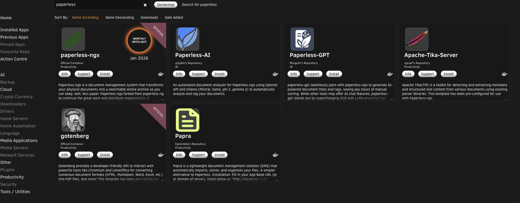 If you search for Paperless in Community Apps, you'll see quite a few different results. Here's what we're installing and why.