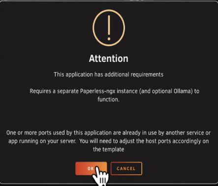 You might get a warning about a port conflict. Port 3000 is likely already taken by Gotenberg from part two. Switch the Paperless AI port to 3030 to get around that.