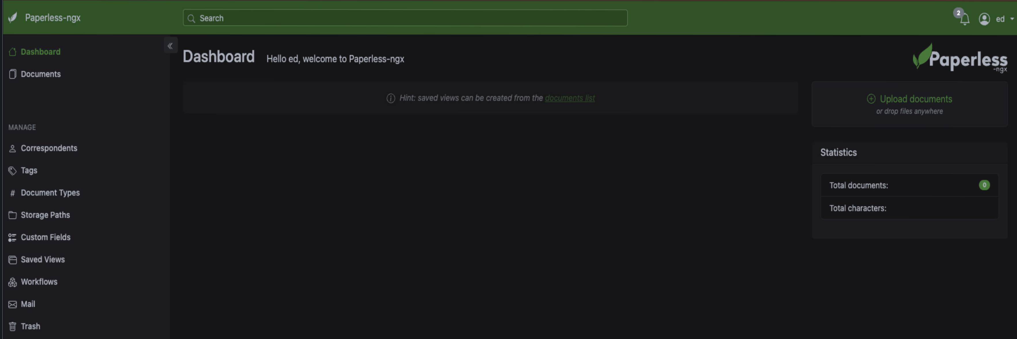Log into Paperless AI and you'll see the dashboard. If it's already completed a scan, you'll see a count of documents that have been processed.