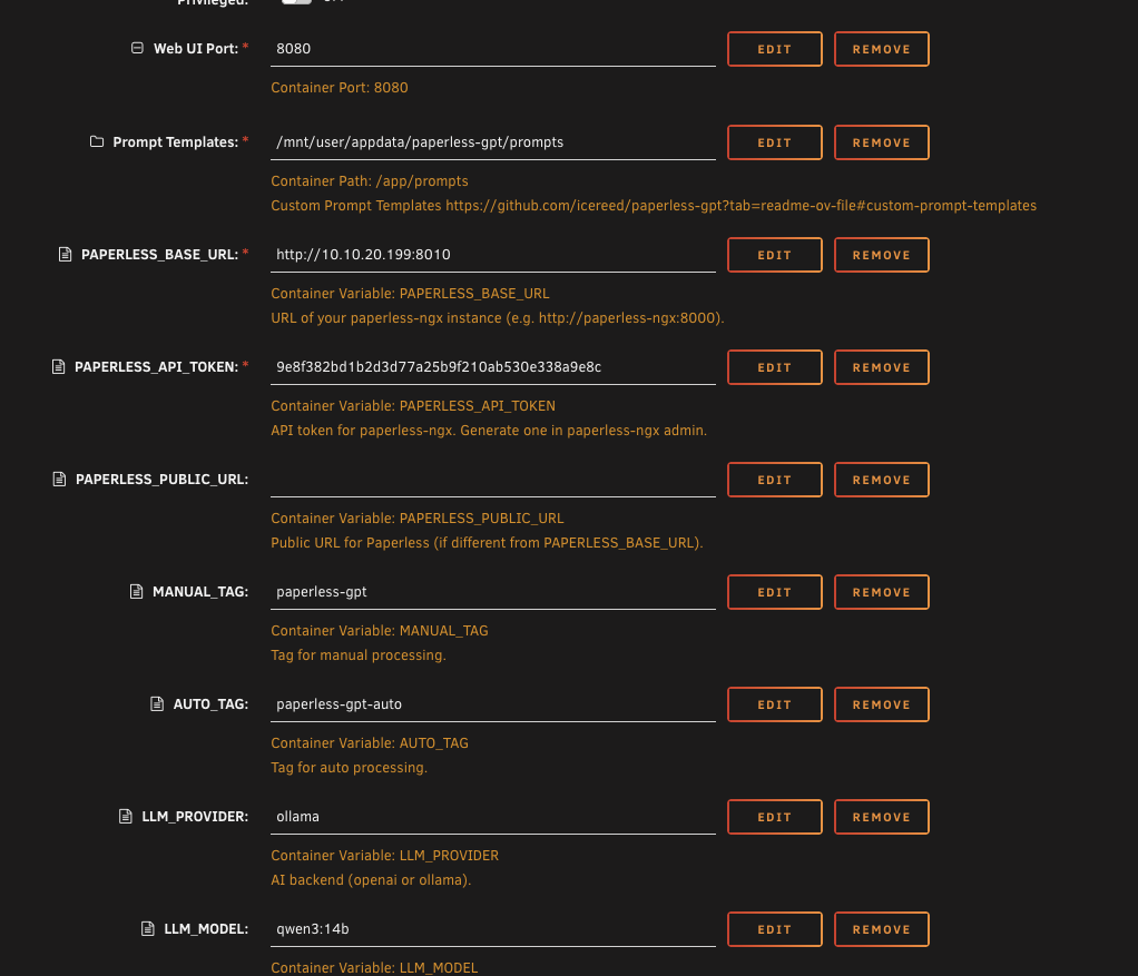 To make this work, we need two environment variables added to the Paperless container. Go to the Docker tab, edit the Paperless container template, and add these.